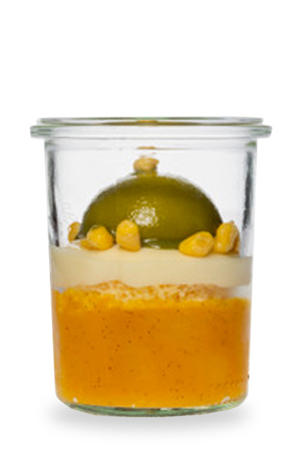 Mangokompott, Kokosbiscuit, Yuzumousse, Matcha Nappage